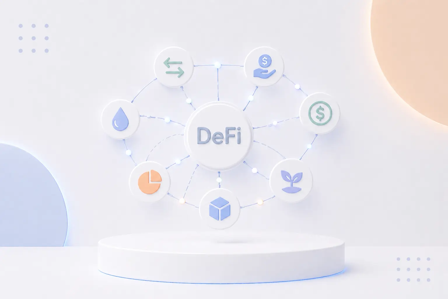 DeFi (Decentralized Finance) to ekosystem protokołów finansowych zbudowanych na smart kontraktach na publicznych blockchainach. Operacje takie jak wymiana tokenów, pożyczanie, dostarczanie płynności i zarabianie odsetek działają bez banku, brokera ani innego pośrednika — warunki określa kod kontraktu, a nie firma.